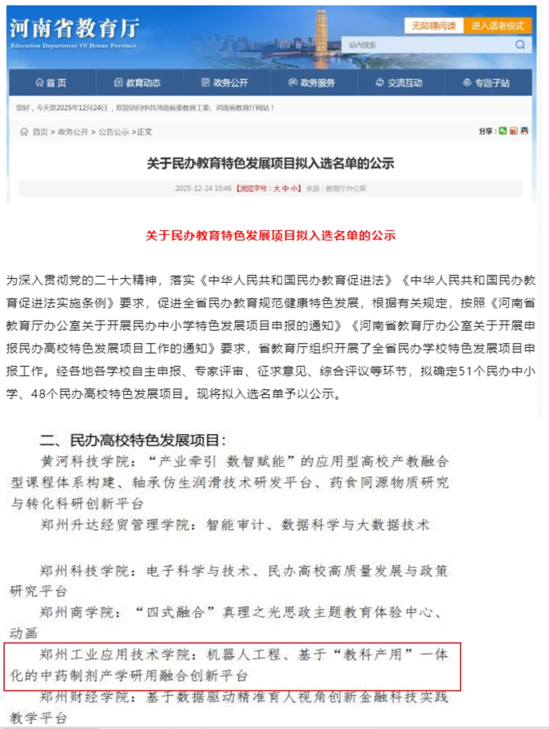 近日,河南省教育厅公示全省民办教育特色发展项目拟入选名单,我院申报的“基于‘教科产用’一体化的中药制剂产学研用融合创新平台”成功入选,成为48个省级民办高校特色发展项目之一。此次入选标志着我院在探索应用型办学与特色发展方面取得的成果,获得了省级教育主管部门的认可。