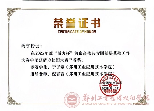 近日,2025年度“活力杯”河南高校共青团基层基础工作大赛获奖结果正式公布,我院药学协会凭借扎实的社团建设、丰富的实践活动与突出的育人成效,在全省众多高校社团中脱颖而出,成功斩获活力社团大赛三等奖,充分展现了我院学生社团的蓬勃活力与共青团基层工作的扎实成果。