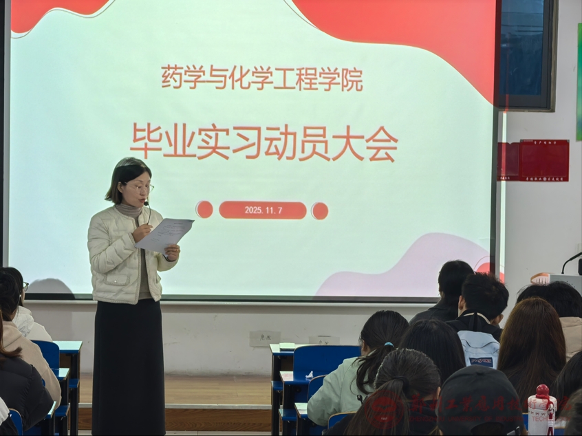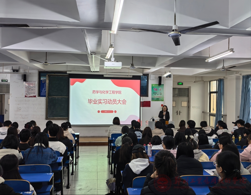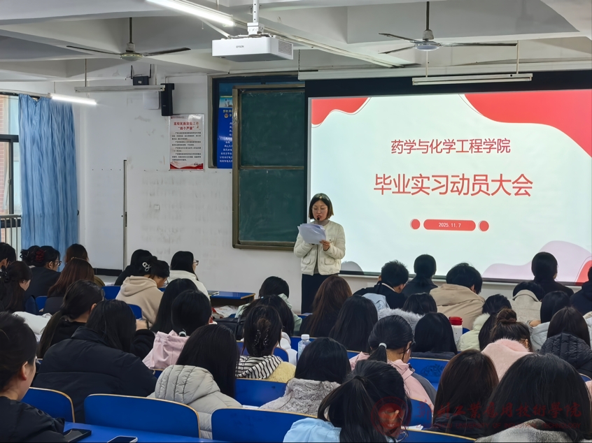 为确保2026届专科毕业生毕业实习工作顺利推进,强化实习管理、明确实践要求、提升实习质量,2025年11月7日,药学与化学工程学院在医学楼南四召开2026届专科毕业生毕业实习动员大会。学院教科研副院长姜亚玲副教授、分团委书记倪言言、教学秘书贠艳培老师、各教研室主任、辅导员老师及全体2026届专科班毕业生齐聚一堂,共同为即将开启的实习生涯凝心聚力、指明方向。会议由教学秘书贠艳培老师主持。