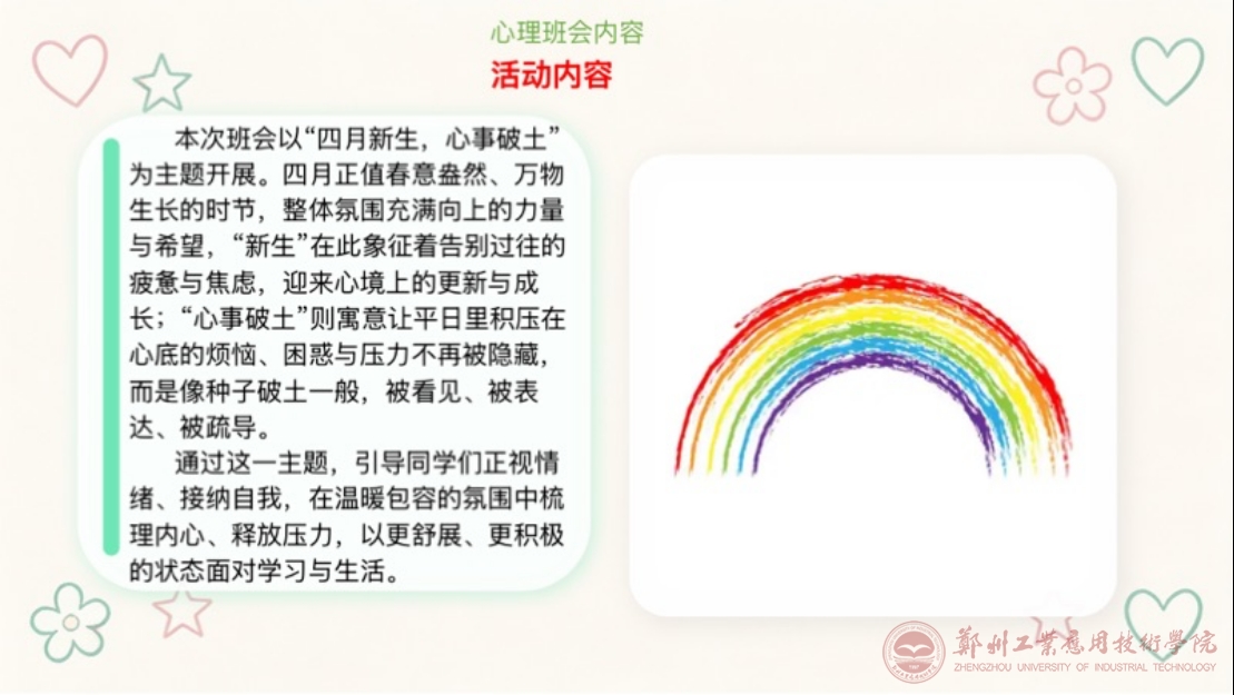 会议伊始,心理部于子童总结了上个月心理活动的不足之处并提出了可行性建议,并明确本次心理工作核心方向;同时,动员各班心理委员召开以“四月新生·心事破土”为主题的心理班会,意在各班传递“轻量情绪波动是成长常态,持续困扰需主动调适,以积极心态迎接四月新生”的理念,并筹备好宣传材料;借以班会,加以结合“拥抱四月美好生活”分享,来帮助大家舒缓情绪、缓解焦虑。