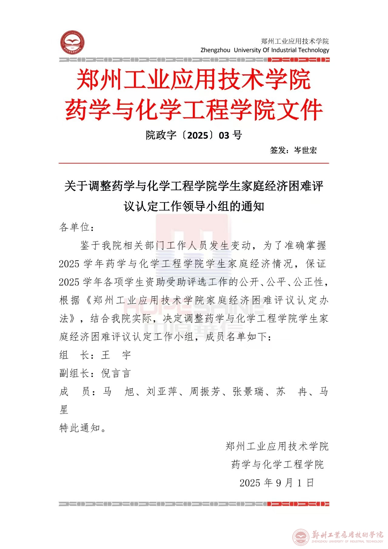 关于调整药学与化学工程学院学生家庭经济困难评议认定工作领导小组的通知